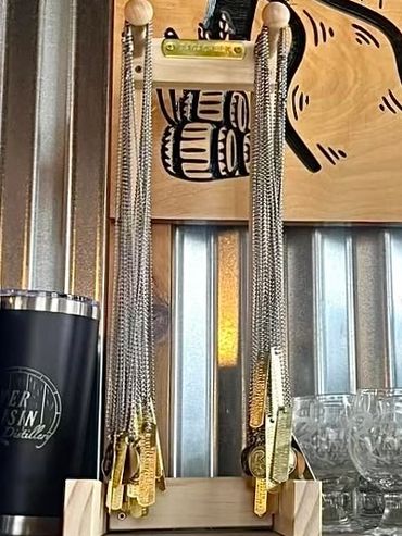 TagaCheer is sold on 8" chains with a tag and charm on a wine ring in breweries that are on the TagaBrew Trail. For wineries, distilleries, meaderies, or cideries that do not serve beer, TagaCheer comes on a 27" chain with a tag and charm on a wine ring (or jump ring for custom charms).